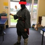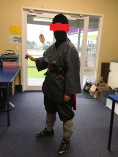 金曜日は本のキャラクターパレードがあることをお話したら、忍者になりたいというG君。ぎょ~っ!理学治療の後に時間があったのでThe Warehouseなどを見てみたのですが、忍者の衣装などどこにもなく、あっても「タートルズ」なのです。。。仕方ないので地元の$2ショップで「忍者セット」なるものを買い、夫の作務衣、私のガウンの紐、レッグウォーマー、長女の黒いマフラーで即席忍者を作ることに!